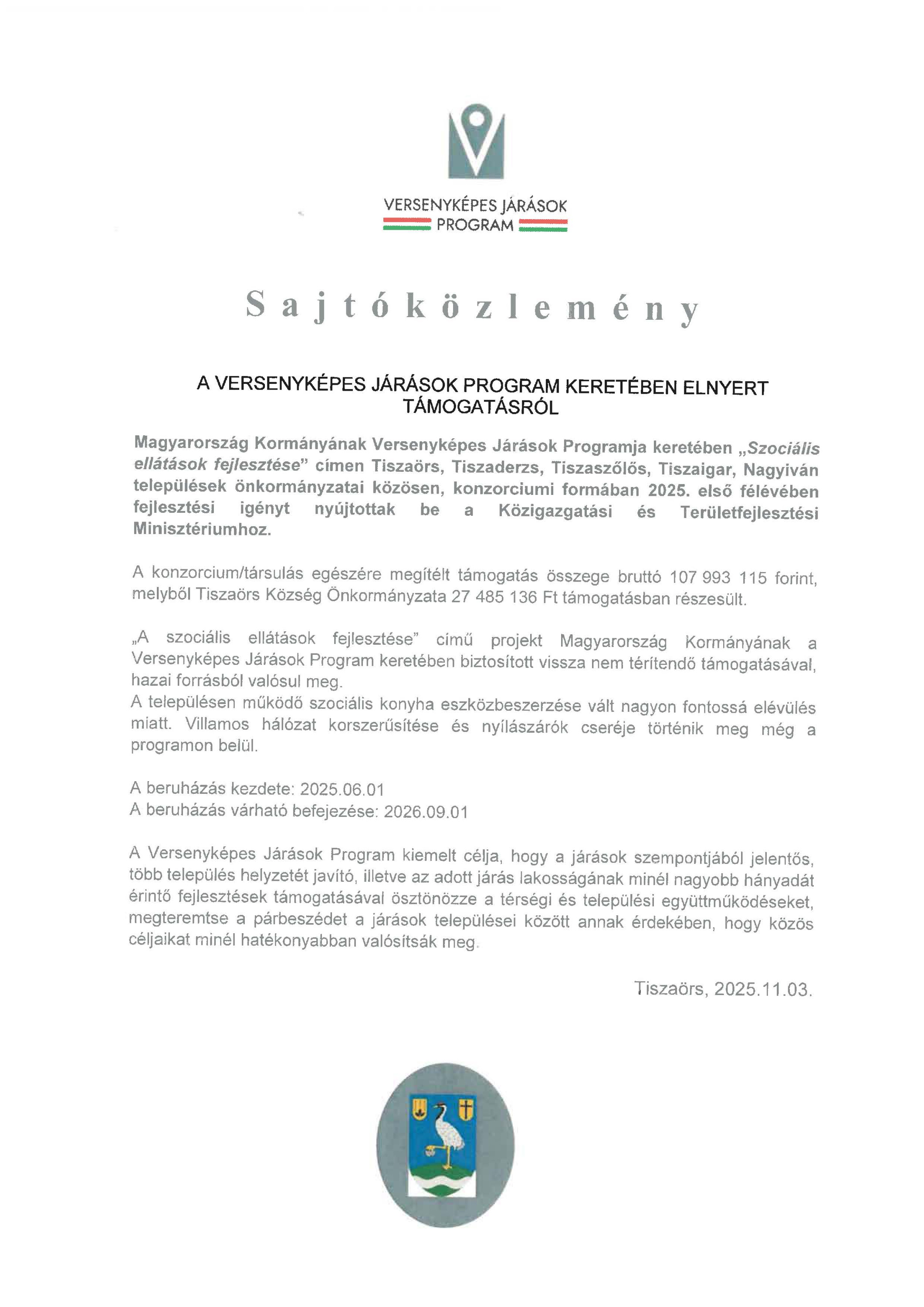 Sajtóközlemény Versenyképes Járások keretében elnyert támogatásról
